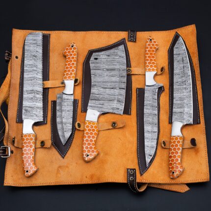 Custom Handmade Honey Comb Handle Damascus Steel Kitchen 7 Knife Set