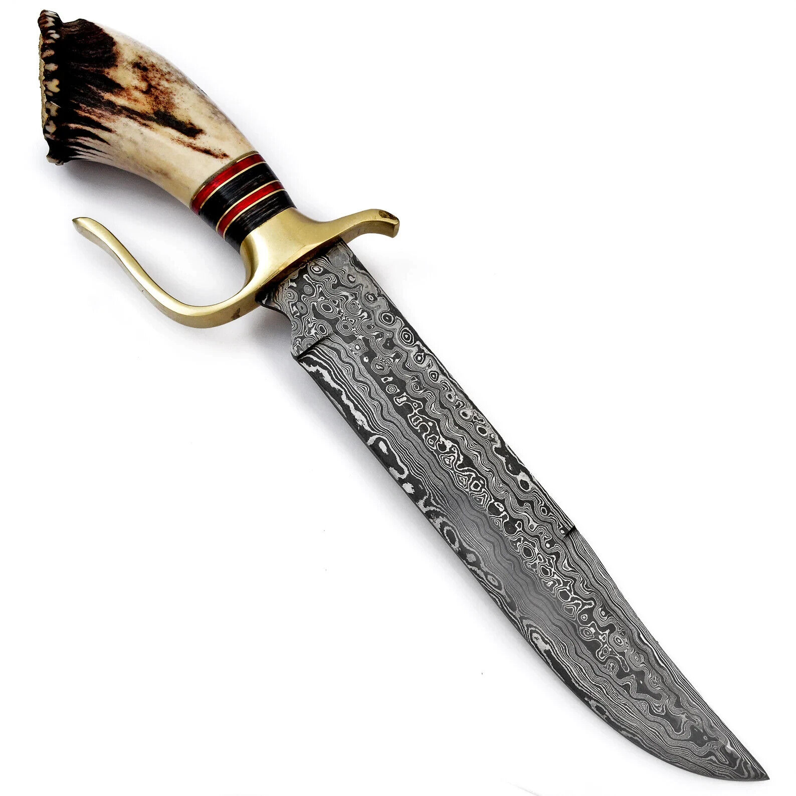 Custom Hand Made Damascus Steel Bowie Knife With Stag Crown Handle, Sheath