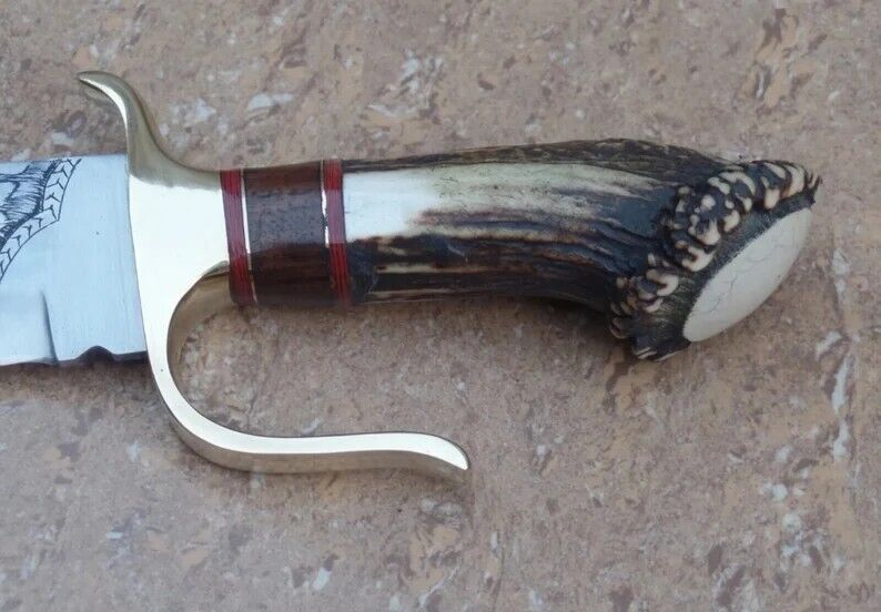 CUSTOM HAND MADE ACID ETCHED WOLF D2 TOOL STEEL HUNTING BOWIE KNIFE WITH STAG CROWN HANDLE & LEATHER SHEATH