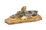 Wooden pedestal with three decorative parts and one wild boar carved figure, made of mammoth tusk.