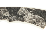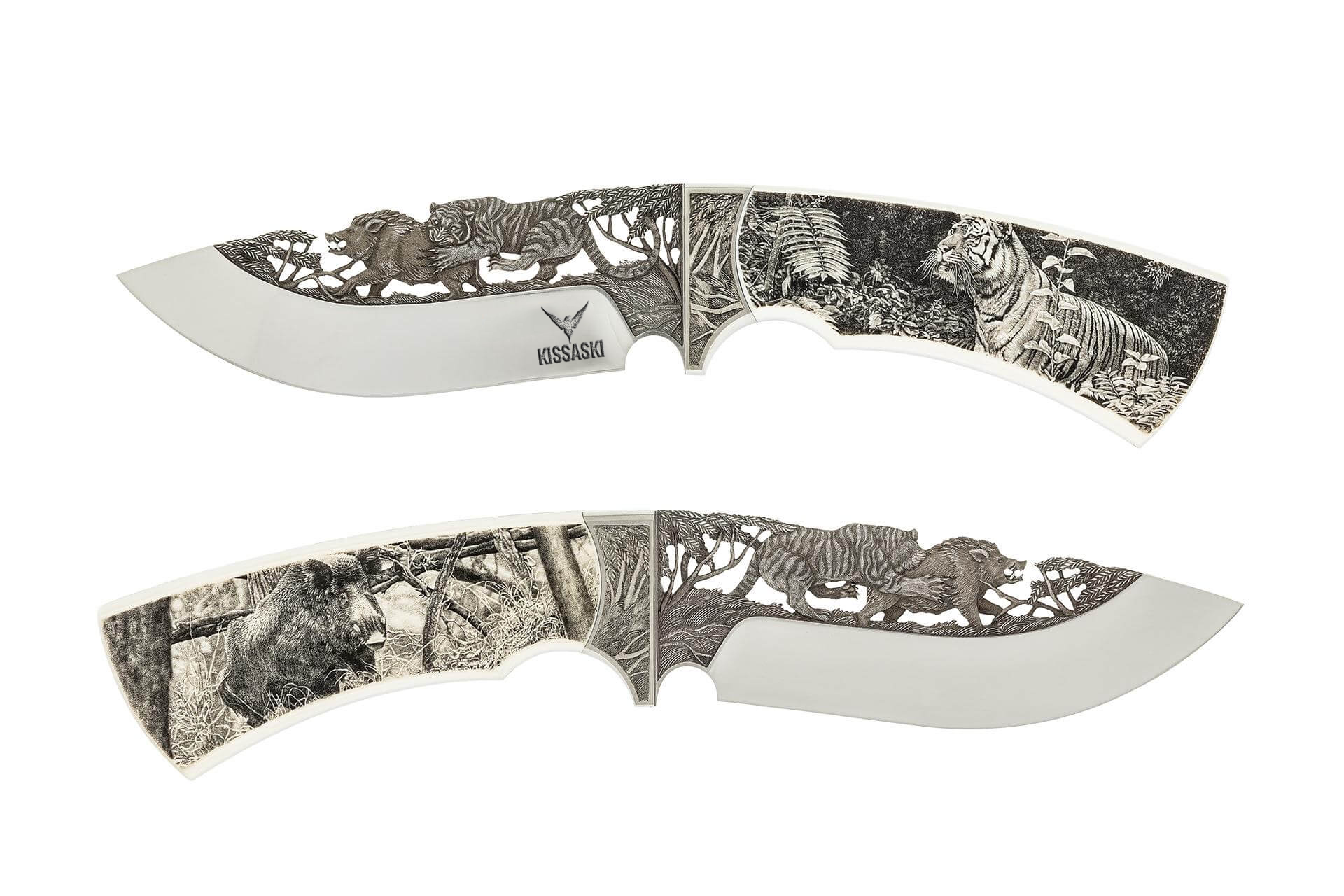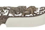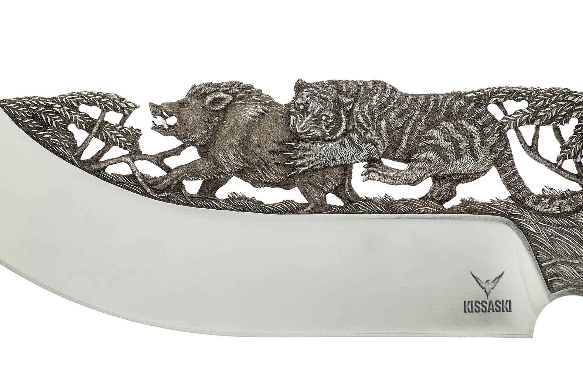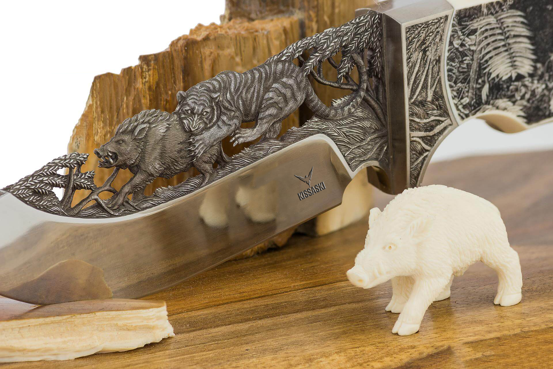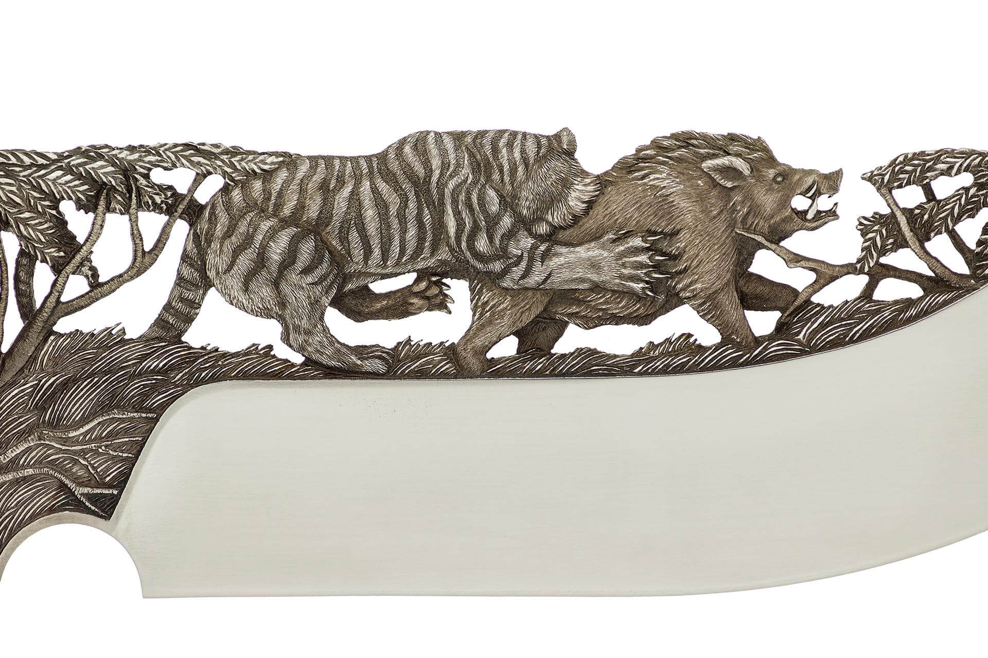 Blade of Bohler N695 steel. Very profound and detailed hand engraved depiction of a tiger, attacking a wild boar and surrounding of jungle vegetation ornaments. A hand satin finish involves sanding the blade in one direction with increasing degrees of a fine abrasive. A satin finish shows the bevels of the blade, showcasing the lines of the knife, while reducing its reflective glare.