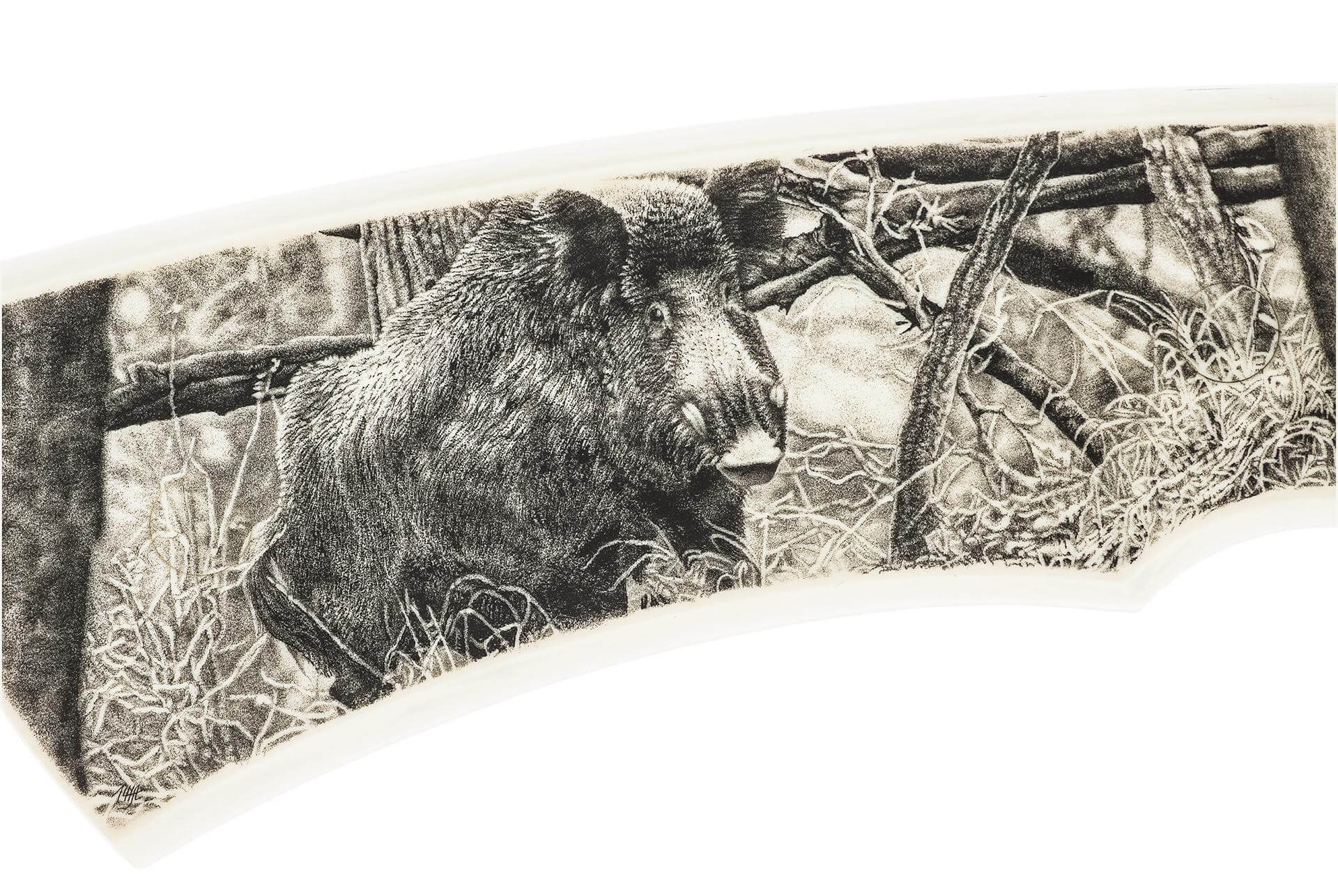 Mammoth tusk handle with titanium guard with one finger groove. Scrimshaw technique of decoration with detailed pictures. Wild boar on one side and lurking tiger in the jungle on the opposite side.