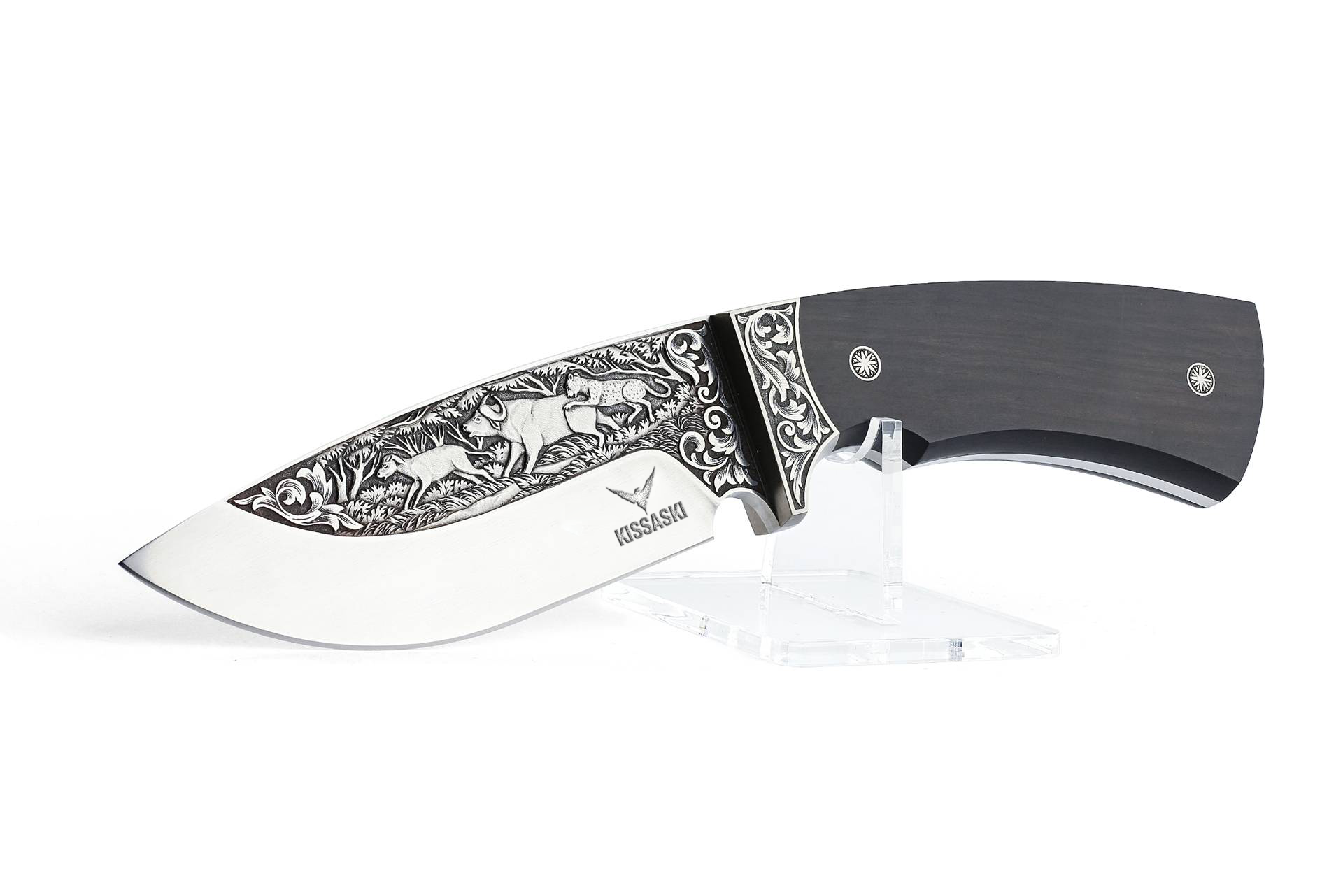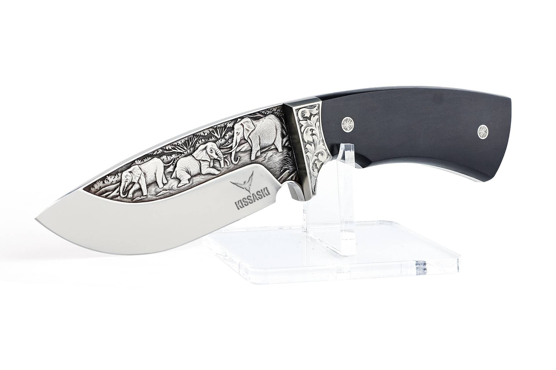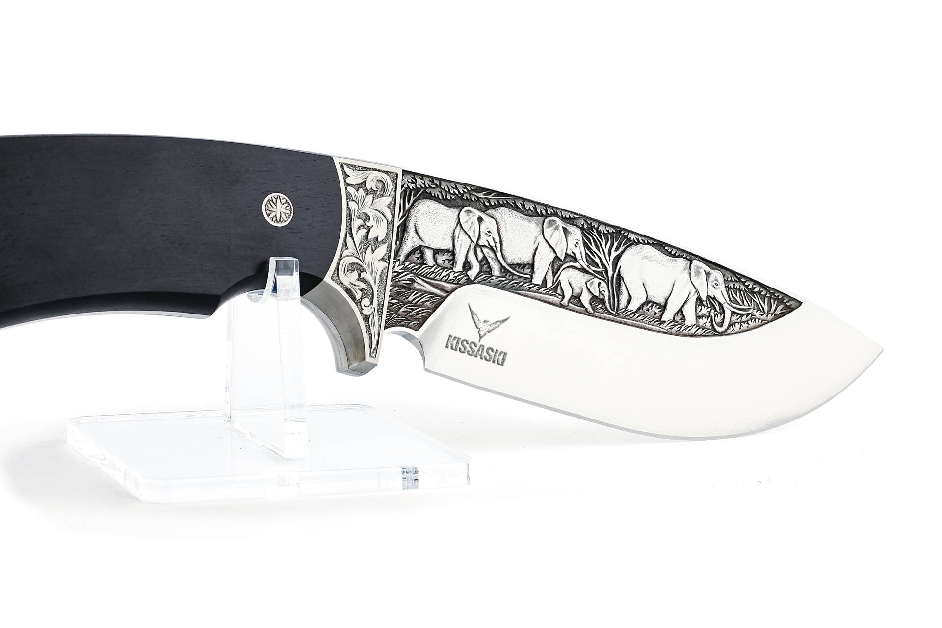 Hand engraved knife produced in a single copy. Fixed blade knife, skinner type. Blade of Bohler N695 steel. Very profound hand engraved pictures of elephant herd and savannah landscape on both sides. A hand satin finish involves sanding the blade in one direction with increasing degrees of a fine abrasive. A satin finish shows the bevels of the blade, showcasing the lines of the knife, while reducing its reflective glare.