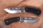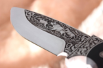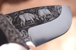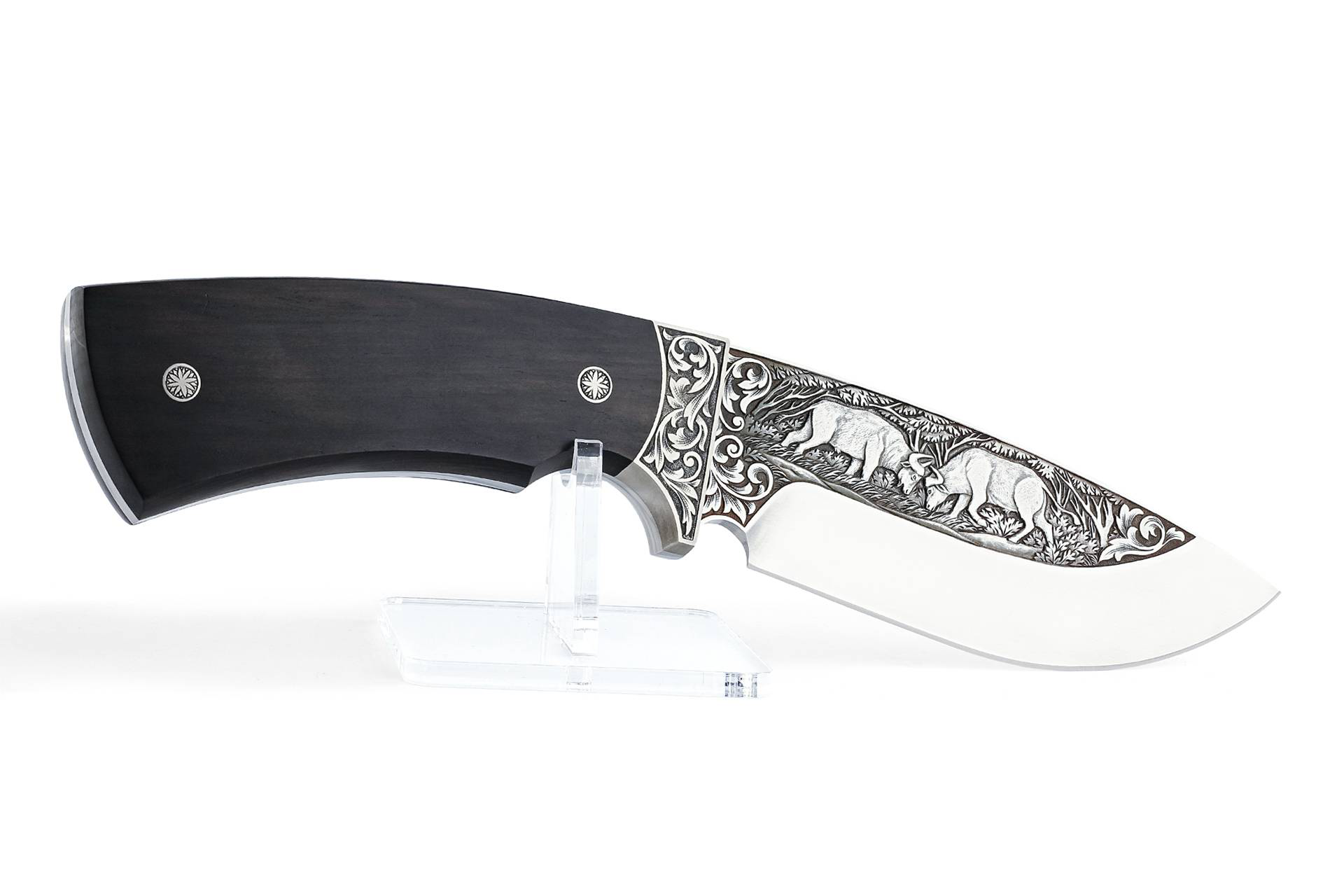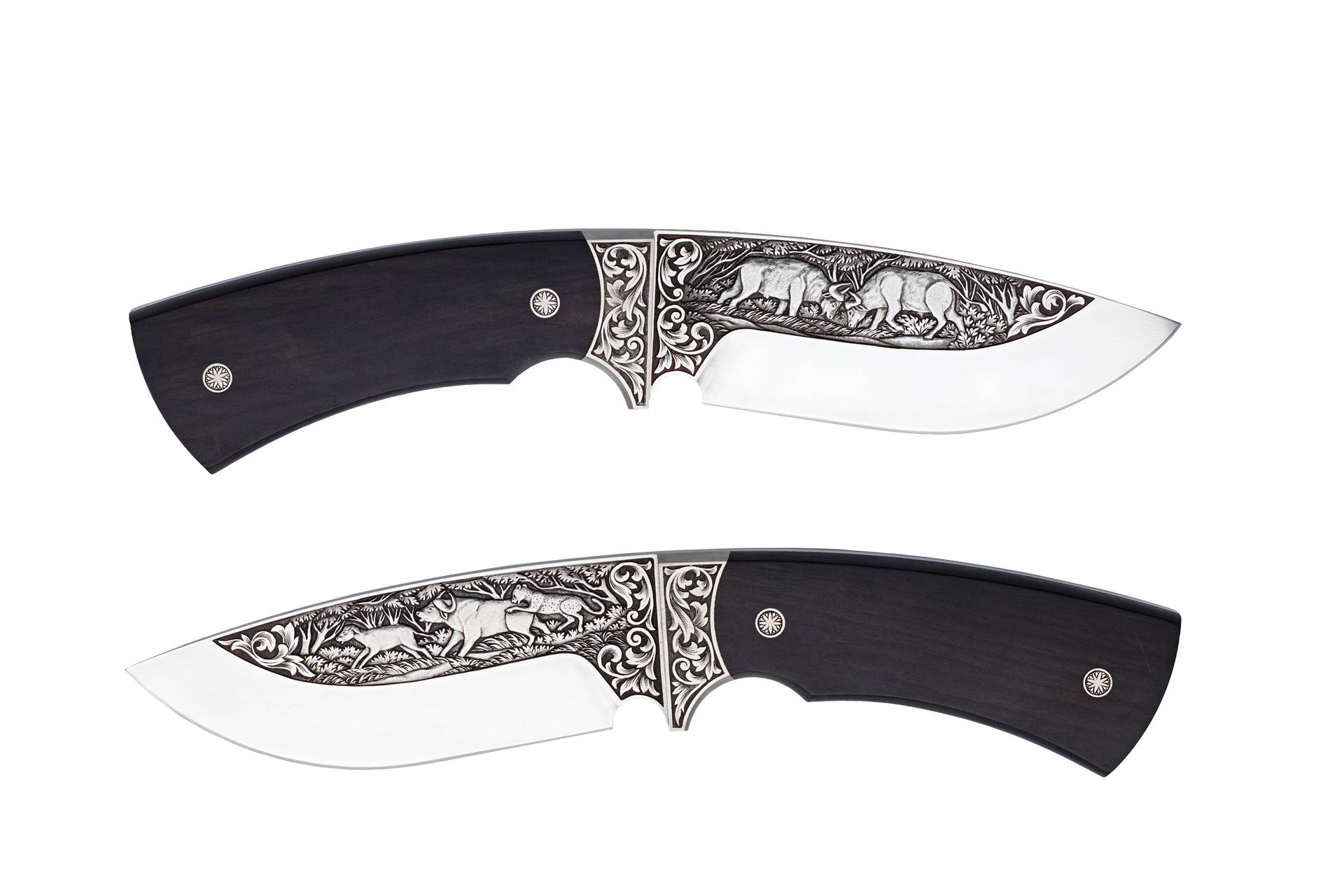 Hand engraved knife produced in a single copy. Fixed blade knife. Blade of Bohler N695 steel. Very profound hand engraved pictures on both sides. Two fighting buffalos and savannah landscape depicted on one side. A mother buffalo and a calf attacked by a leopard and savannah landscape engraved on the opposite side. A hand satin finish involves sanding the blade in one direction with increasing degrees of a fine abrasive. A satin finish shows the bevels of the blade, showcasing the lines of the knife, while reducing its reflective glare.