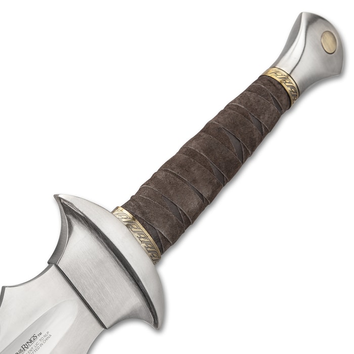 This detailed sword is a reproduction of the prop featured in The Lord of the Rings – “The Fellowship of the Ring.” An industry leader in fine film prop reproductions, has meticulously recreated the actual filming prop. The 15 1/2″ blade was created from stainless steel instead of carbon steel as used on the original prop, in order to guarantee the replica will last a lifetime with little maintenance. The cross guard and pommel are cast metal and the grip is wrapped with genuine leather exactly like the prop. The replica sword is 23 1/2″ in overall length and it comes with a display plaque.