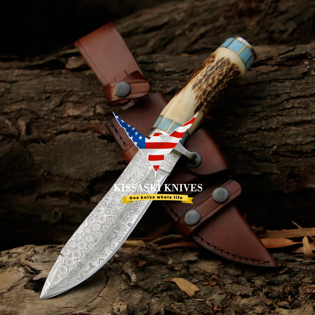 Custom Hand Made Damascus Steel Bowie Knife With Stag Crown Handle, Sheath